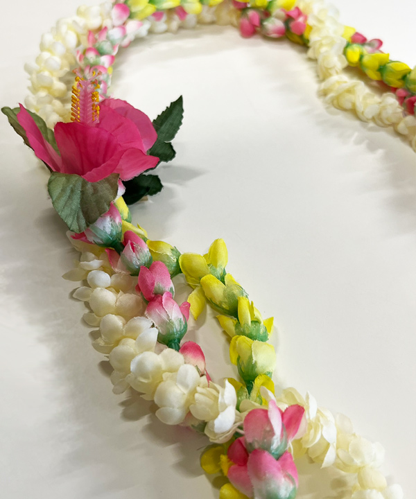 ピカケとローズのつぼみが3連絡まった可憐なレイ。