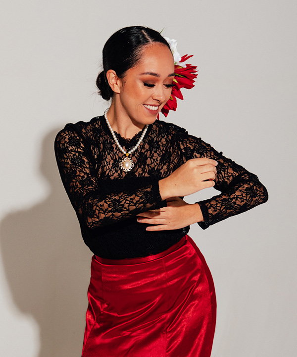 エレガントなアレンジで魅せるプラスワンアイテム。透け感のある繊細なストレッチレースが、肌をより美しく見せるブラウスです。肌の露出をさりげなくカバーしつつも、フラの動きを妨げません。スカートはもちろん、ドレスとのクラシカルなコーディネートもおすすめです。
