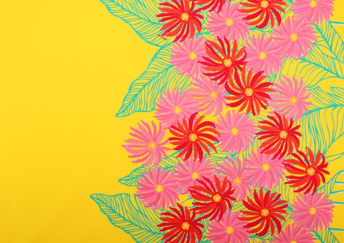 上へ上へ向かって伸びゆく美しく、たくましいガーベラの花たちを描きました。可憐で華やかなデザインでステージ映えするデザインです。