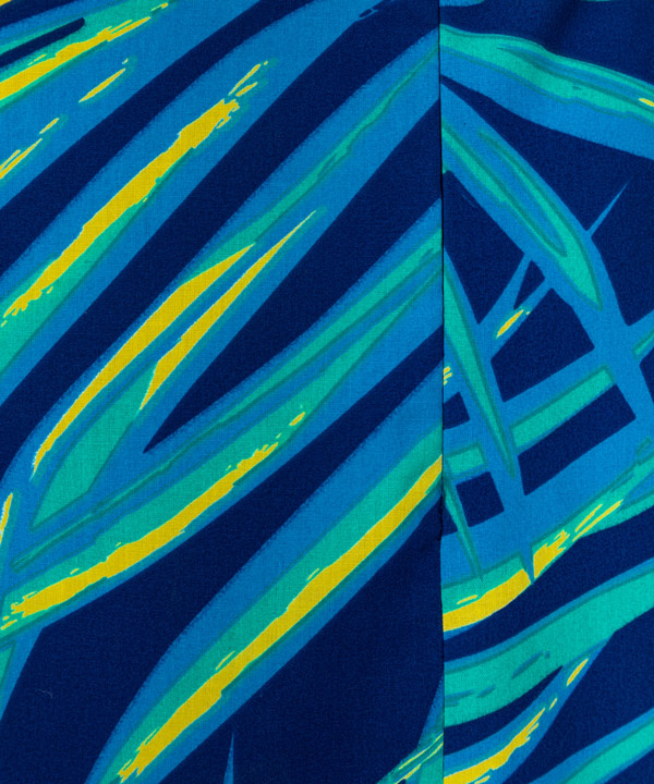上身頃と切替下には柄生地を使用した、印象的で躍動感のあるスタイル。胸元は華やかなレイや大ぶりのアクセサリーでアレンジするのがお勧めです。