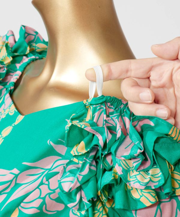 エレガントな縦切替えのAラインシルエット。 ふんだんにフリルをあしらった袖からの程よくあいたデコルテのラインが美しいスタイル。 たっぷりのフリルをあしらったお袖は肩・袖口ゴムが調整可能でふんわり感を調整できます。