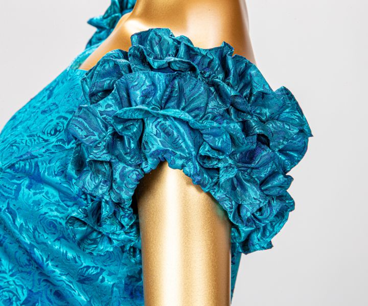 写真のサンプルでは、光のあたり方で表情を変える立体的なバラ柄が特徴的なジャガード生地を採用。 ライトの下で重厚に輝くクラス感のあるドレスに仕上げました。 軽量でほど良い張りとコシがある生地なので、前後差のある裾のシルエットが美しく広がり、 脚さばきが楽で踊りやすいのも嬉しいポイントです。