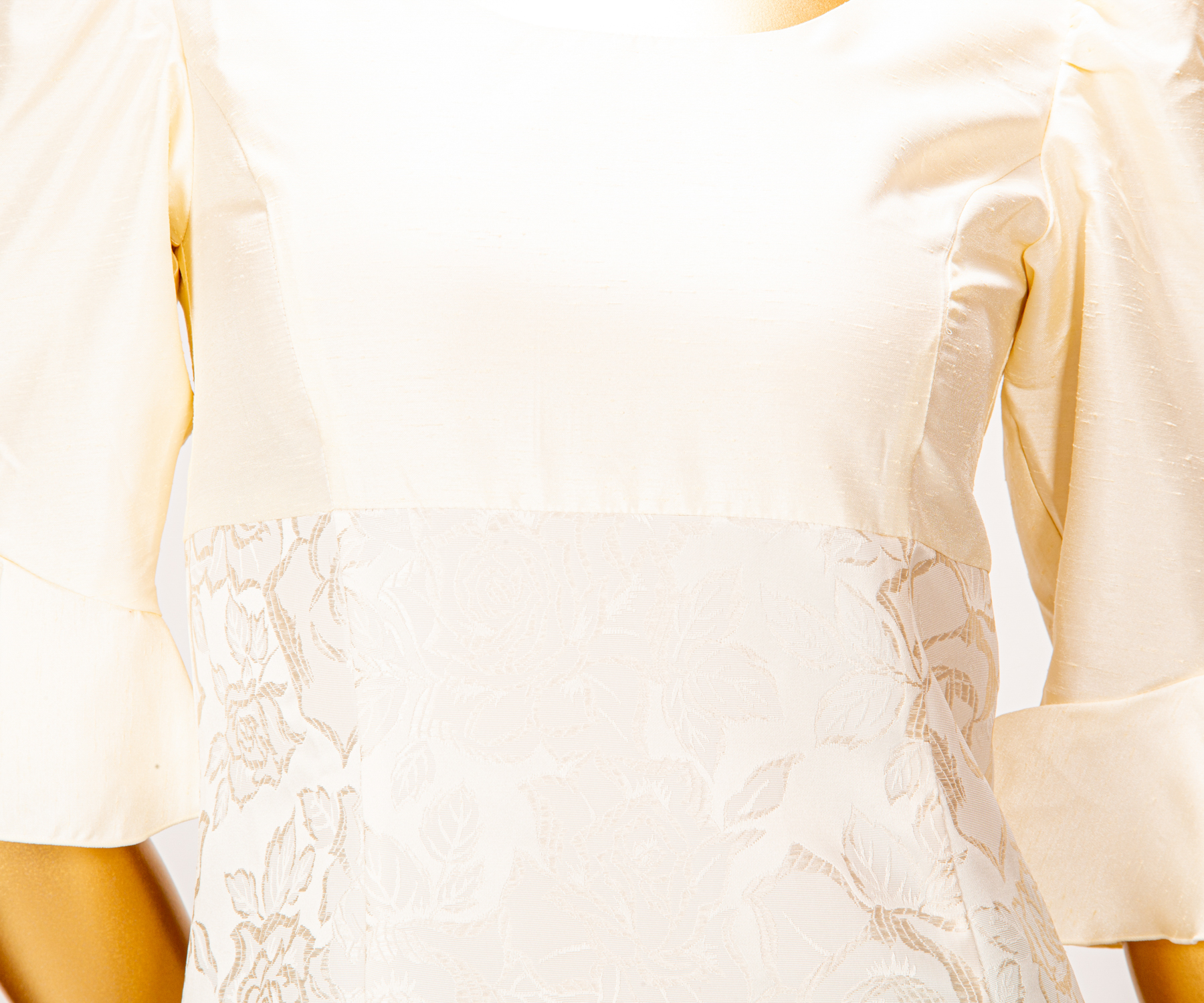 気になる二の腕を隠せる長めのお袖。 袖口にはフレアを取り付け、腕の動きをエレガントに演出できるシルエットに。 コンパクトな上身頃、背中の開きはV字にし、すっきりとした印象に仕立てました。 バスト下の切替えで脚長スタイルアップ効果が期待できます。