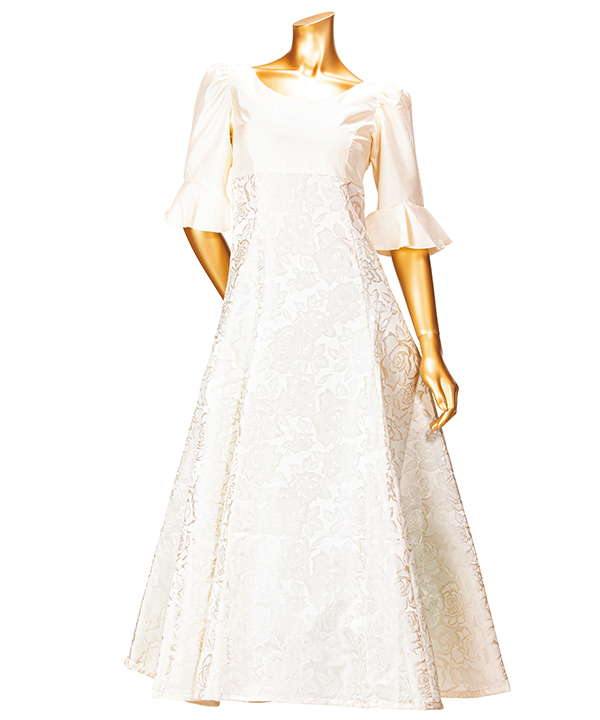 こちらのサンプルはシルキーシャンブレーシャンタンとプリンセスローズを組み合わせたラグジュアリーな1着。 上品な風合いのシルキーシャンブレーシャンタンと、ライトの当たり方で印象の変わるローズの表情が気品にあふれたスタイルです。 舞台映えする華やかさと、生地の軽さの踊りやすさを兼ね備えたデザイン。