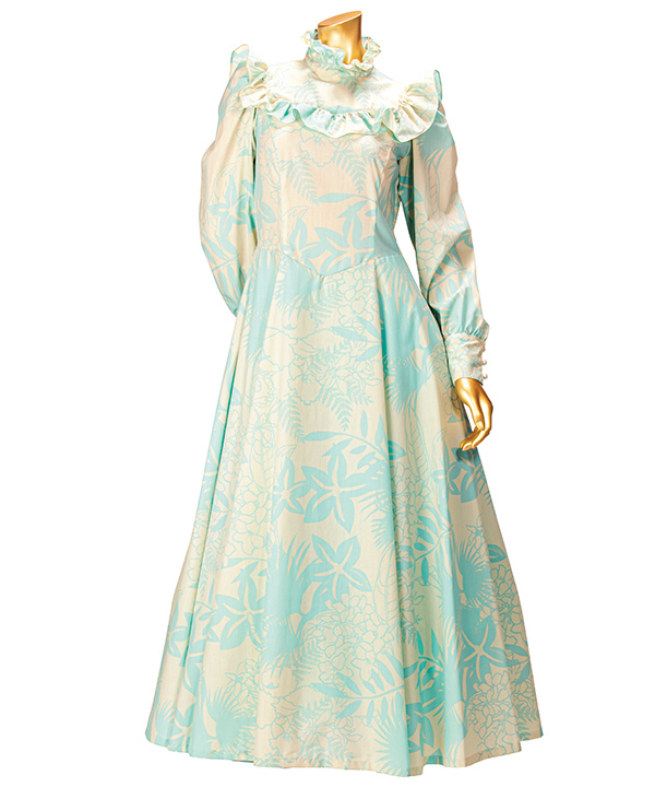 クラシカルな印象のスタンドカラー・ドレス。 美しいフリル使い、ゆったりとしたお袖の優美さ、袖口カフスのパールボタンのアレンジなど、気品にあふれた格調高いスタイルです。