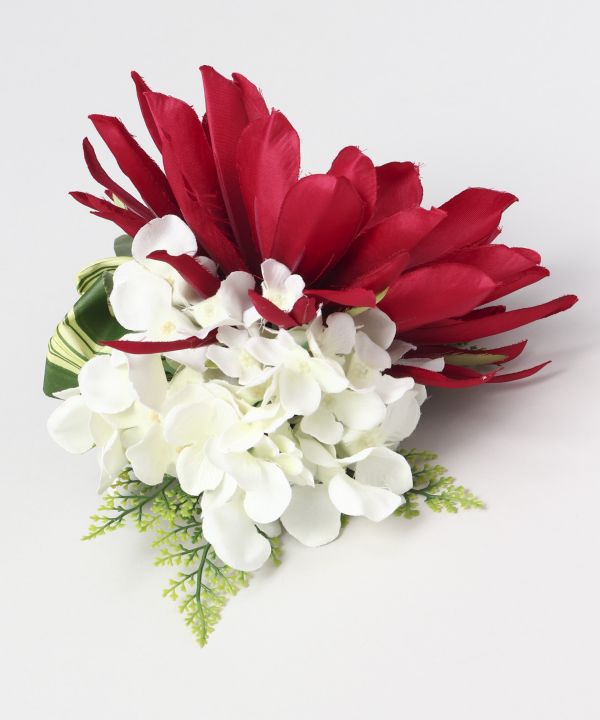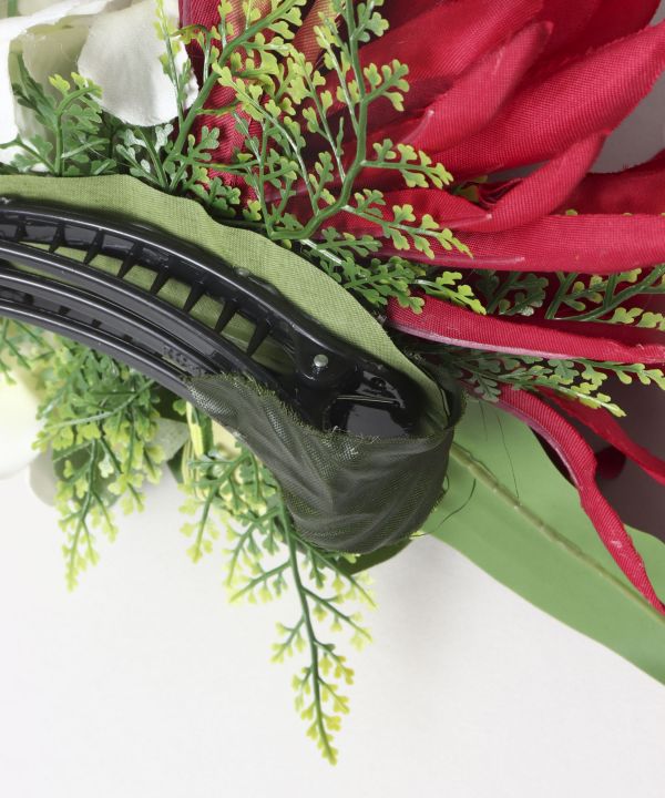 花言葉は「艶やかな美人」。儚く美しい月下美人の香り立つようなクリップです。顔周りに華やぎを与える大胆な1輪の月下美人の花とドラセナのコンビネーション。付ける向きを変えるだけで違った印象を楽しむことができます。