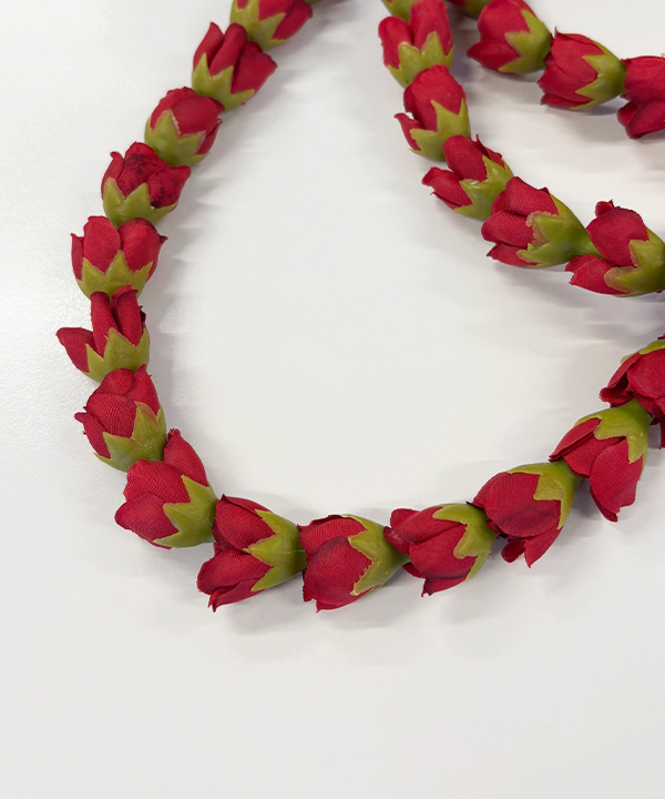 マウイ島を代表するローズ(ロケラニ)のロングレイ。一連使いはもちろん、二連や三連使いもおすすめです。優雅に揺れるロングレイは踊りをしなやかなに演出してくれます。