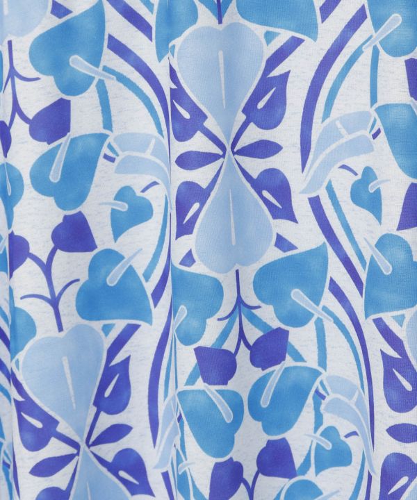 《Ocean Blue Bird-オーシャンブルーバード-》幸福の花とされるアンスリウムを、ポリネシアンキルトのエッセンスで、上品かつモダンなデザインに仕上げました。伸縮性にすぐれ、さらっとした肌触りでしわも目立ちません。ウエスト部分を胸元まで上げてショート丈のワンピースとしてもご着用いただけます。煌くステージにはもちろん、リゾートウェアやタウンユースにもご着用いただけます。