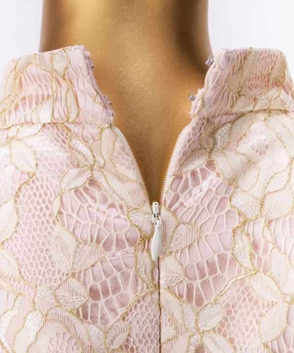 全体に華やかな光沢感のあるサテンを使用、上身頃・立ち襟(スタンドカラー)にはその上に繊細なラメ入りレースを被せました。瀟洒なレースと輝くサテンの光沢とのコンビネーションでクラス感あふれるドレスに仕上げました。