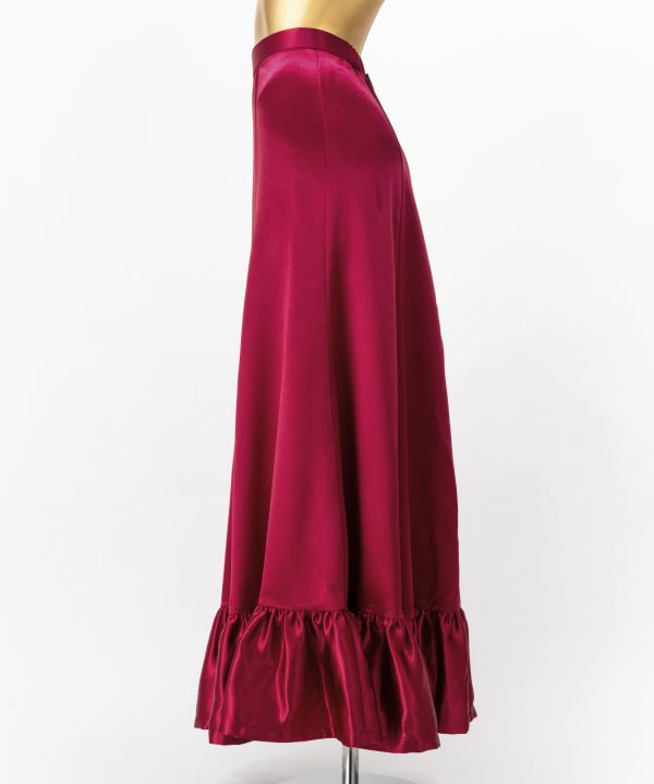 前ウエストは細めのベルトですっきりとさせ、後ウエストは安心のゴム仕様です。裾には幅広のフリルをあしらいエレガントな印象に仕上げました。丈は1センチ単位でオーダー可能です。