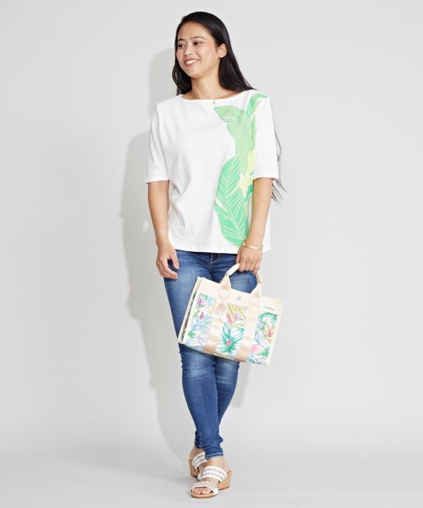 南国の風に揺れる大きなバナナリーフを幾重にも重ねたアートワーク。モダンハワイを感じるカラーでグラフィカルにアレンジしました。従来のレッスンTシャツよりも身幅に余裕をもたせたサイズ感の5分丈Tシャツ。ポリウレタン混で伸びの良い生地を使用しています。肉厚のしっかりした素材感でストレッチ性も高く、型崩れしにくい特徴があり、長年ご愛用いただけます。煌くステージで最高の踊りを魅せるためのレッスンに欠かせない、「贅沢な着心地」と「動きやすさ」を追及した機能的なTシャツ。デコルテが見えて女性らしさを演出しつつも、露出は少なめの広すぎない襟元です。
