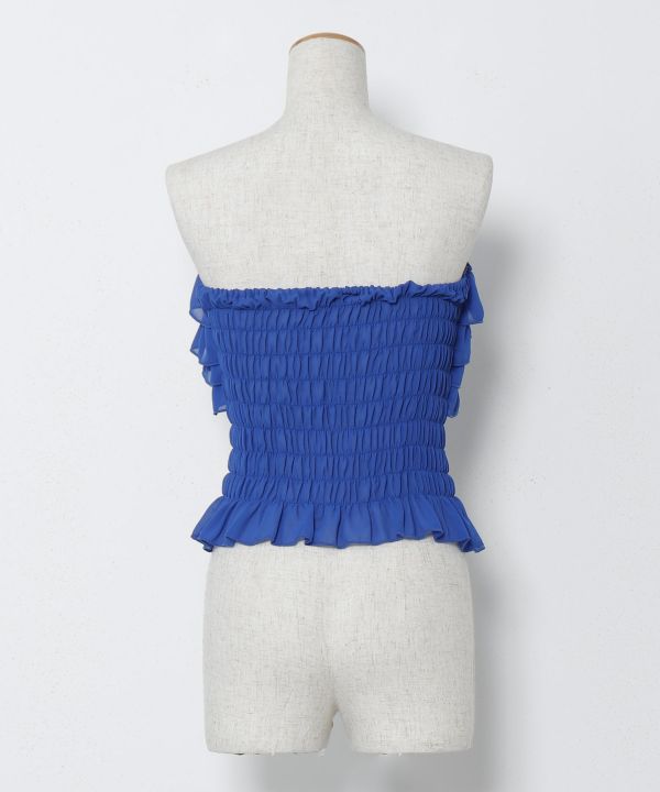 たおやかさをアシストしてくれる柔らかでエアリーなフリルベアトップ。スカートやパレオなど様々なボトムスと相性が良く、またベアトップドレスのアレンジアイテムとしてもおすすめです。シャーリング仕様の後身で対応サイズが幅広く、早着替えもしやすいデザイン。取り外し可能なブラパッド入り。ストラップ受け付き。