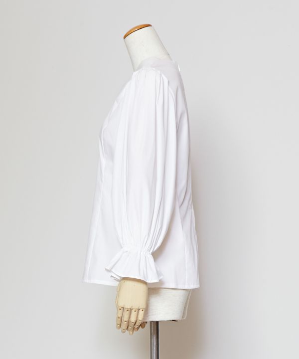 贅沢なボリュームの袖が特徴的なバルーンスリーブブラウス。肩山を立ち上げてロイヤルスタイルにも。また、袖口のフリルを内側に入れ込んで、短い袖丈にアレンジも可能な汎用性の高い一着。衿元、身頃はすっきりとしどんな首飾りにも合わせやすく、背中のファスナーはコンシールを使用し後ろ姿も麗しいデザイン。