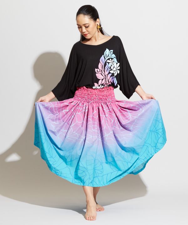 デコルテを美しく見せてくれるボートネックで、前後2wayで着用可能。ゆったりとしたドルマンスリーブは気になる二の腕もカバーしてくれます。レーヨン素材で落ち感が良く、伸縮性があるのでリラックスしつつも女性らしいラインの美しいシルエットです。古典的なポリネシアンタトゥに色鮮やかなグラデーションを加えスタイリッシュなデザイン。