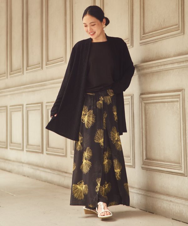愛されレフアが二色使いで上品にデザインされた巻きスカート仕様のパンツ。シャーリングのウエスト、軽くてエアリーな素材でストレスフリーな着用感です。踏み出す度に風を受けて膨らむワイドシルエットが美しく、真夏でも涼しくご着用いただけます。