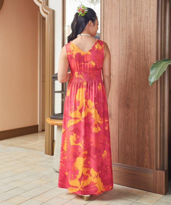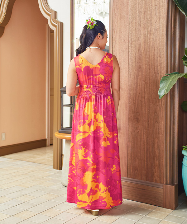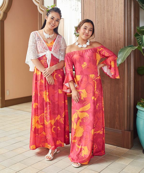 ビビッドカラーを効かせたダイナミックなハイビスカス(アロアロ)のアートワーク。幾重にも重ねた奥深い色層がポリネシアンムードを際立たせます。ヴィンテージ・ムウムウを想わせるノスタルジックさとトレンド感をミックスしたデザインに仕上げました。