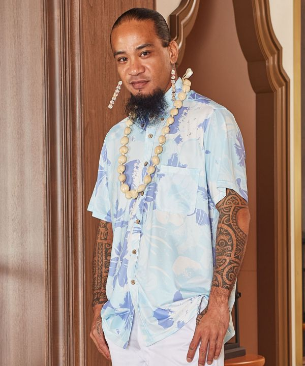 ストレッチ素材を生かした、ややスマートでスタイリッシュなボタンダウンシャツ。ウッド調ボタンがポリネシアンムードを誘います。カジュアル、デイリーユースにもコーディネートしやすいデザインです。