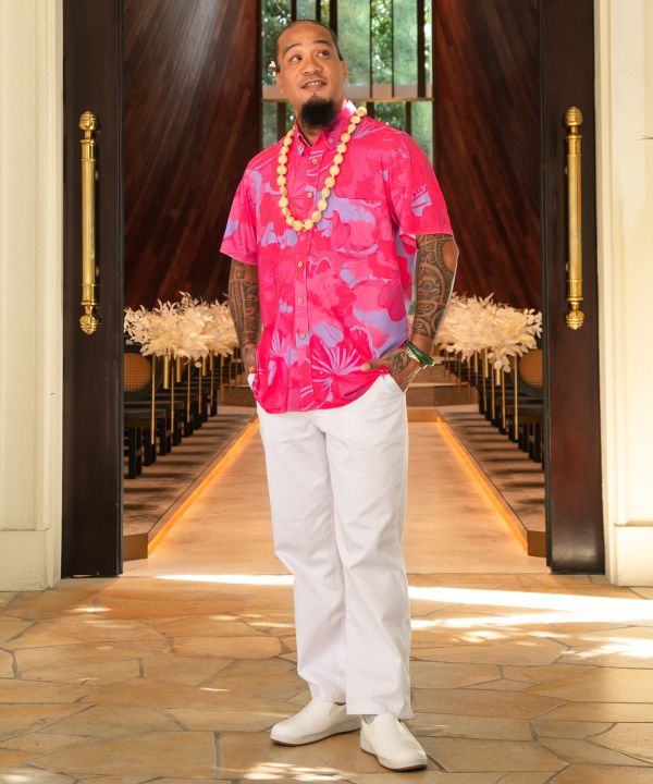ストレッチ素材を生かした、ややスマートでスタイリッシュなボタンダウンシャツ。ウッド調ボタンがポリネシアンムードを誘います。カジュアル、デイリーユースにもコーディネートしやすいデザインです。