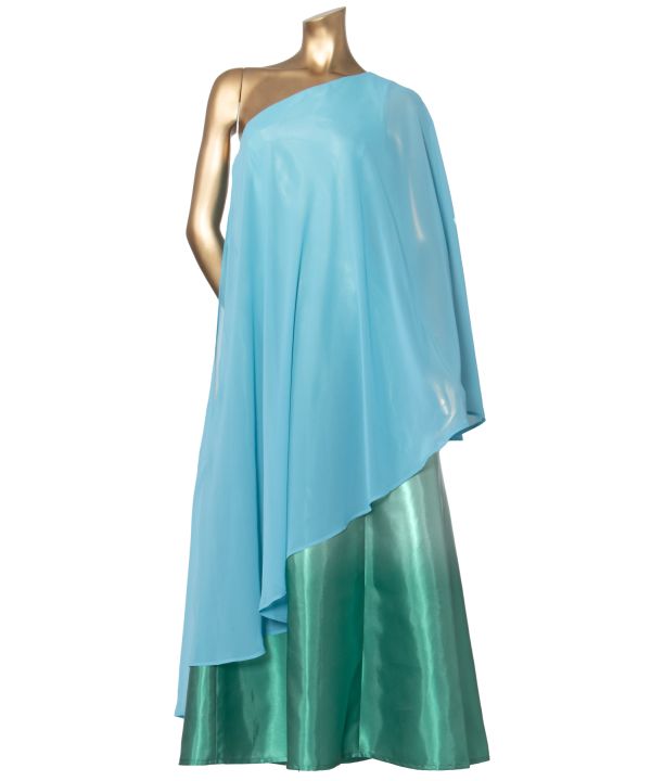 豊かなドレープのシフォンから覗くグラデーションのシルキーアートサテンの輝きとが相まった品格の漂う高貴なドレス。