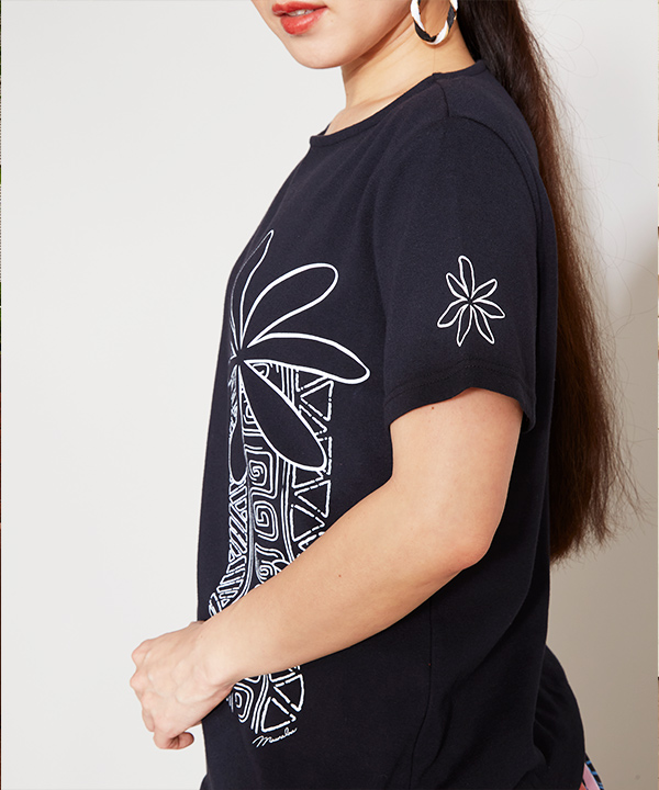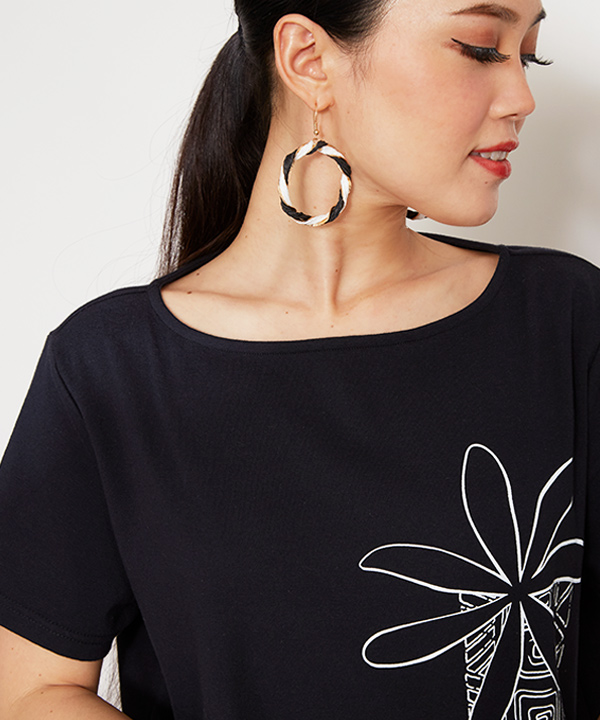 女性らしいデコルテが見えながら露出は少なめの広すぎないネックラインのTシャツ。人気のタパティアレ柄をプリントしました。ウエストインした裾がスカートからズレ出しにくい長めの丈感。程よいゆとりがボディラインを和らげるワイドめのシルエット。伸縮性のある素材で、煌めくステージで最高の踊りを魅せるためのレッスンに欠かせない「動きやすさ」「着心地」を追及した機能的な一枚です。