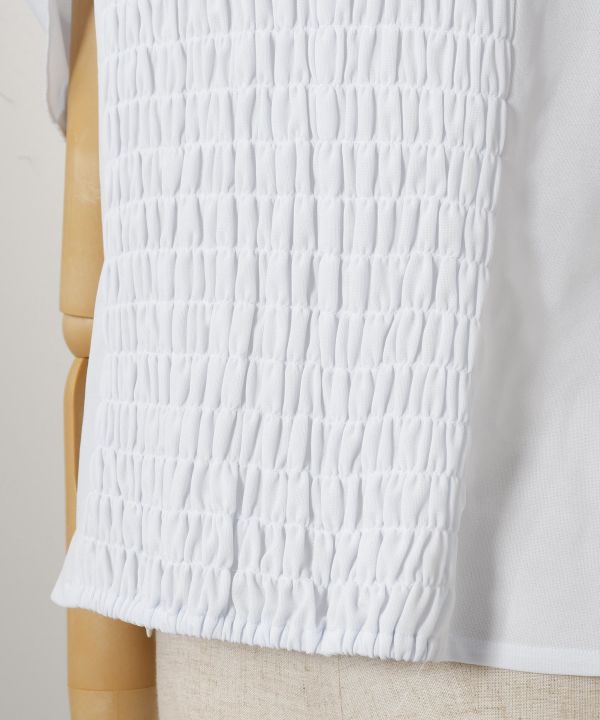 ワイドなフリルカラーが目を惹くステージ用ブラウス。ストレッチ性のあるアムンゼン調の生地を使用し、上品さと動きやすさを兼ね備えています。背面シャーリングと脇ファスナーで着脱しやすいデザイン。襟周りには調整ゴムがありお好みでしぼりの調節が可能です。背面に向って幅が広がるフリルは優雅に揺れ、観る人の記憶に残るステージを演出します。