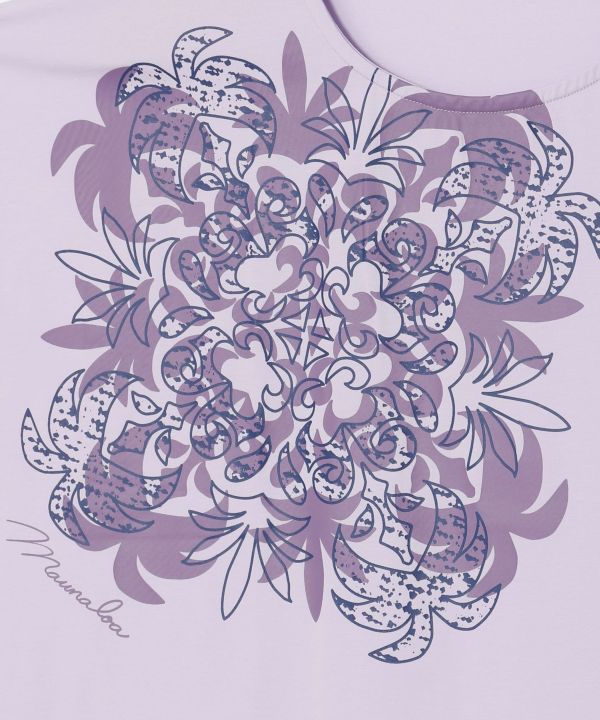 定番モチーフのキルトがスタイリッシュに描かれたTシャツ。触るとひんやり冷たい接触冷感の生地は滑らかな肌触りが特徴的です。ゆったりとしつつも女性らしく綺麗めに着られるシルエットで、二の腕やお腹を目立たせずリラックスした着こなしに。フラレッスンやタウンユースにもおすすめです。
