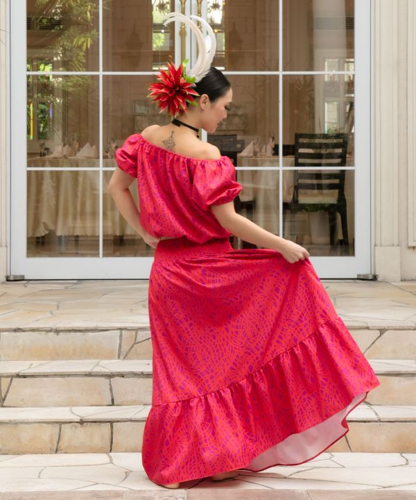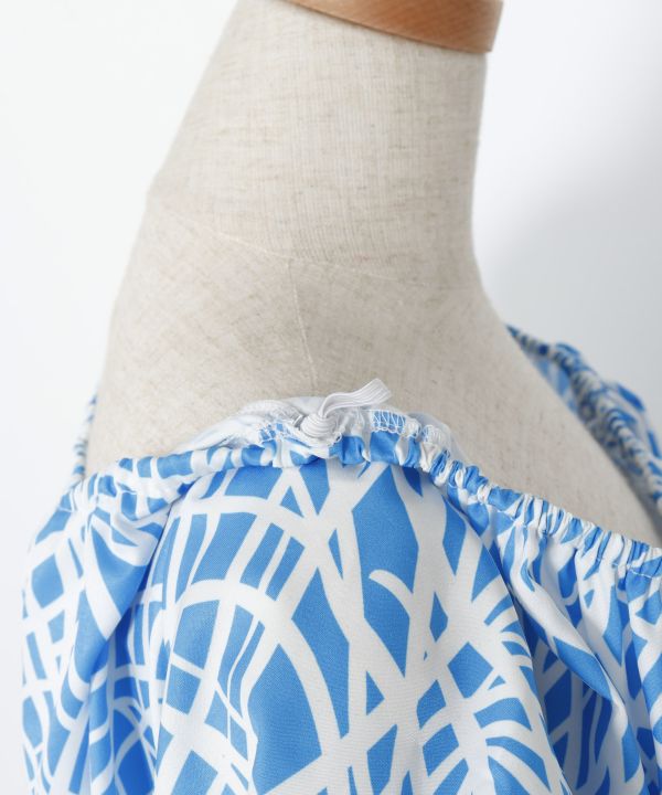 オンショルダー、オフショルダー、ワンショルダーとアレンジ自在のセットアップドレス。ナル(波)をイメージした爽やかな総柄は上品なスタイルを演出してくれます。セットアップは勿論、お手持ちのアイテムと組合せて多彩なコーディネートをお楽しみいただけます。リゾートウェアからブライズメイドやフラステージのチームドレスとしてもおすすめです。トップスは襟周りと袖口がゴム仕様になっており、スカートは前面に大胆なタック、背面にはたっぷりのシャーリングでボリュームのあるシルエットに。