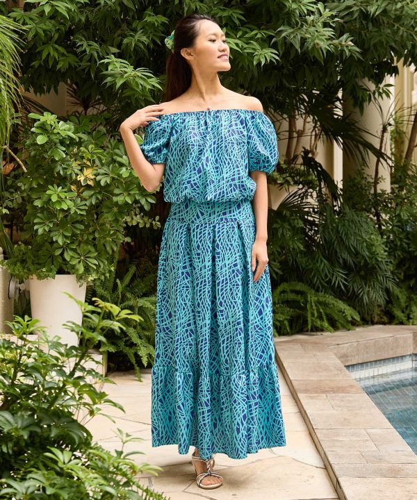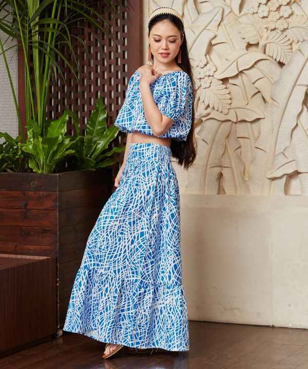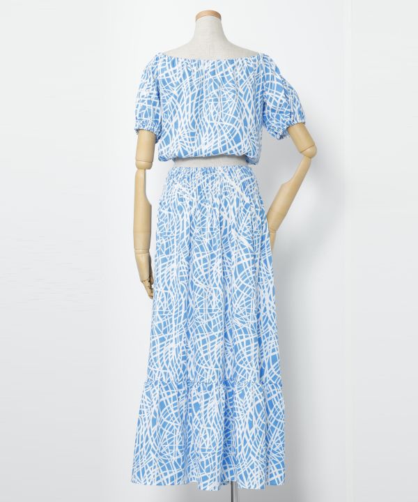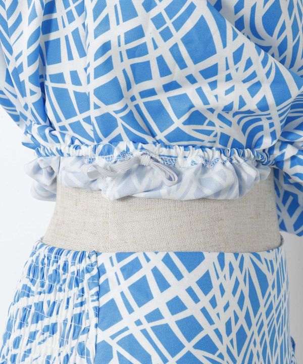 オンショルダー、オフショルダー、ワンショルダーとアレンジ自在のセットアップドレス。ナル(波)をイメージした爽やかな総柄は上品なスタイルを演出してくれます。セットアップは勿論、お手持ちのアイテムと組合せて多彩なコーディネートをお楽しみいただけます。リゾートウェアからブライズメイドやフラステージのチームドレスとしてもおすすめです。トップスは襟周りと袖口がゴム仕様になっており、スカートは前面に大胆なタック、背面にはたっぷりのシャーリングでボリュームのあるシルエットに。