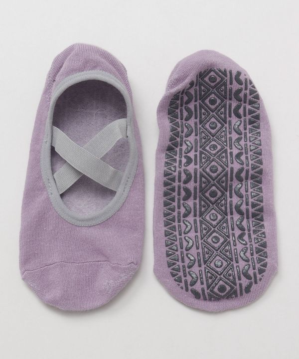 滑り止めの付いたレッスンソックス。バレエシューズのようなデザインで、クロスしたゴムがしっかりと足にフィットします。汗をかいても滑りにくく通気性にも優れているのでフラやタヒチアンのレッスンにおすすめ。