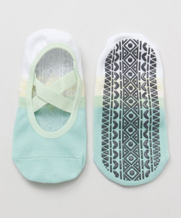 滑り止めの付いたレッスンソックス。バレエシューズのようなデザインで、クロスしたゴムがしっかりと足にフィットします。汗をかいても滑りにくく通気性にも優れているのでフラやタヒチアンのレッスンにおすすめ。