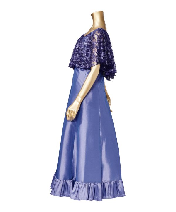 ライトによって変化する豊かな色層とハイエンドの輝きを持ちながら、軽やかに広がるテキスタイル=シャイニーシャンブレーにラメが上品に輝くレースをあわせたラグジュアリーな印象のドレスです。