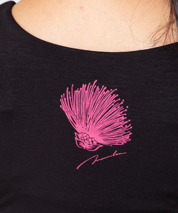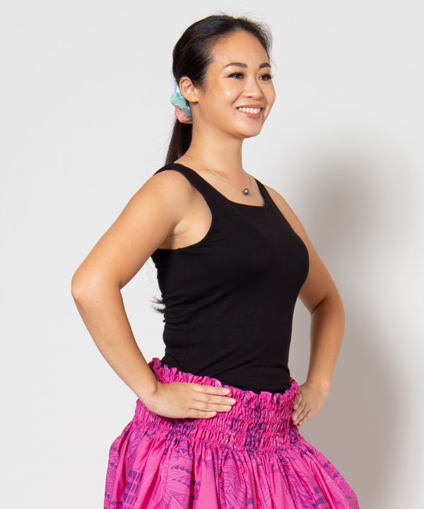 吸湿発熱機能のある生地のカップ付きインナータンクトップ。「誠実」の意味を持つ赤いレフアを背面にデザイン。滑らかな触り心地で、ストレッチ性もある生地なのでフラレッスンはもちろん、タウンユースにもおすすめです。