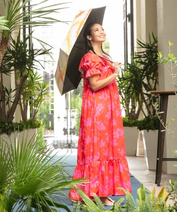 ハワイアンモチーフが印象的な晴雨兼用の折りたたみ傘。遮光率99.99%以上・UVカット率99.9%と高機能で、強い日差しや雨からしっかりガード。遮熱効果もあり、年間を通して活躍します。持ち運びやすいコンパクトサイズで、リゾート気分を日常に添えるアイテムです。