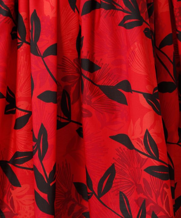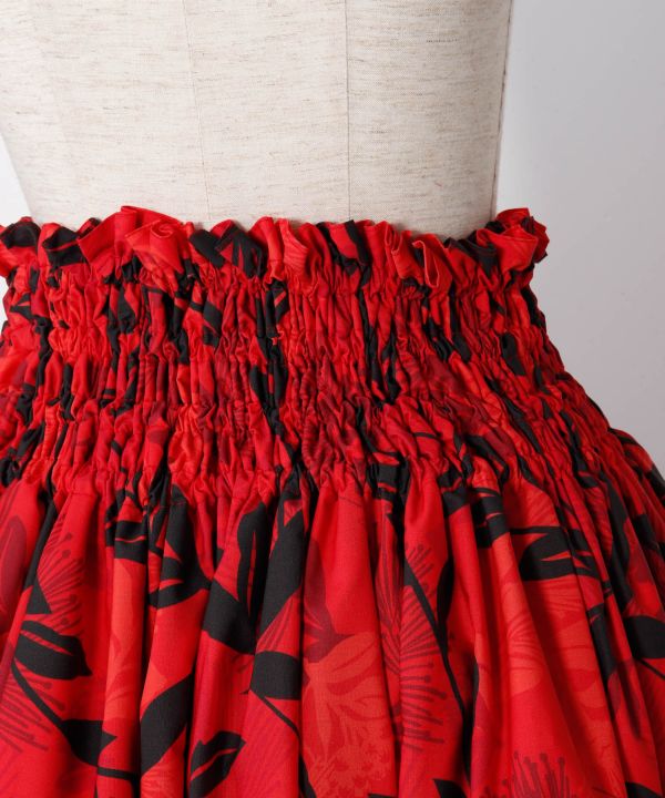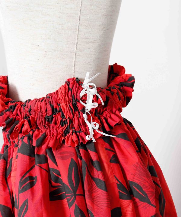 マウナロアオリジナルファブリックを使用した、73cm丈の既製品シングルパウ。気持ちよく風にそよぐパームリーフをイメージしたデザイン。インパクトのある大きな柄と3つの色を使ったリーフが立体的な雰囲気を醸し出します。 4ヤード(約3.6m)のたっぷりギャザーに安定のウエスト4本ゴムを使用しています。ご自身で調整できるウエストゴム仕様。