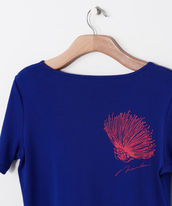 マウナロアの象徴・レフアの花をさりげなく胸元に配置したシンプルなデザイン。洗練されたアクセントとして活躍します。高級超長綿を使用したコットン100%素材で、なめらかな肌触りと優れたストレッチ性を実現。デコルテを美しく見せる衿まわりと、パウにインできる着丈、スリムなシルエットでレッスンにもデイリーにも活躍します。