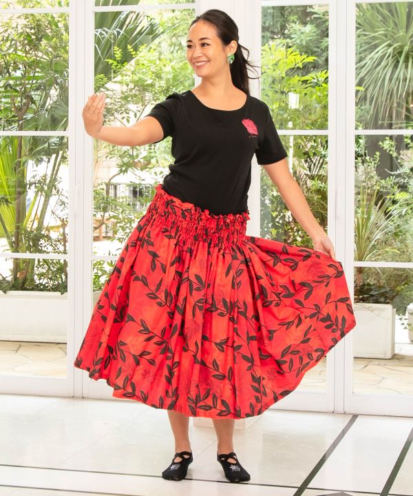 マウナロアの象徴・レフアの花をさりげなく胸元に配置したシンプルなデザイン。洗練されたアクセントとして活躍します。高級超長綿を使用したコットン100%素材で、なめらかな肌触りと優れたストレッチ性を実現。デコルテを美しく見せる衿まわりと、パウにインできる着丈、スリムなシルエットでレッスンにもデイリーにも活躍します。
