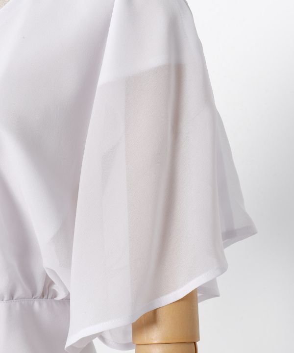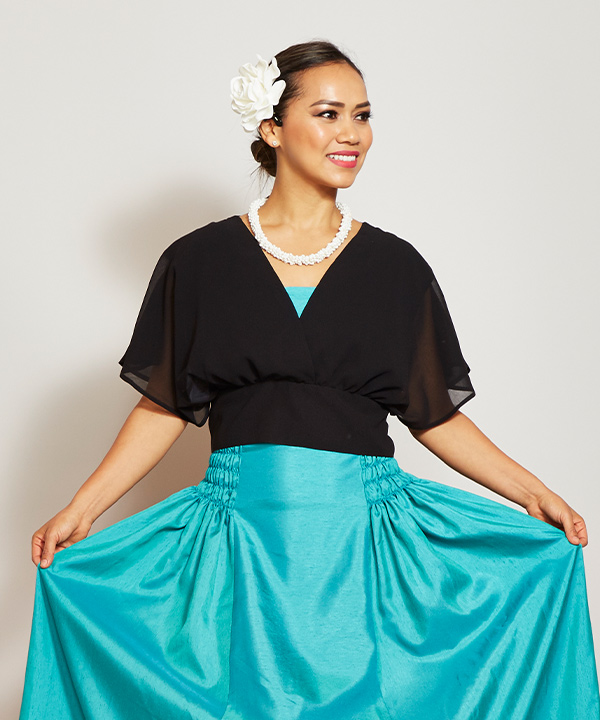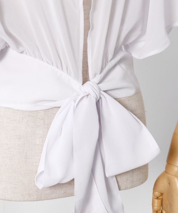 ベアトップワンピースやお手持ちのドレスに重ねてお召し頂くシフォンブラウス。前身頃は透けすぎないように共布裏地付きで安心です。後ろで蝶結びにするバックシャンがより印象を深めてくれます。オーラパ(Olapa)=ハワイ語で「ダンサー」の意味。優雅な動きを演出するダンサーのためのブラウスです。 首後ろにボタンが付いていて、大きなヘア飾りをセットした後でも着脱可能。髪にからまないようにボタンは裏ボタン仕様になっています。ウエスト部分はハイウエストで蝶結びにし調整のできるフリーサイズです。