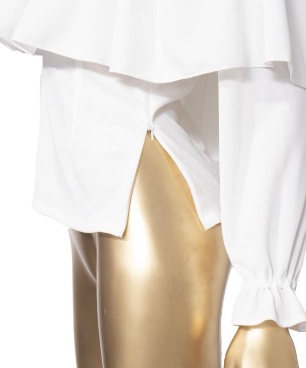 ワイドなフリルカラーが目を惹くステージ用ブラウス。ストレッチ性のあるアムンゼン調の生地を使用し、上品さと動きやすさを兼ね備えています。背面シャーリングと脇ファスナーで着脱しやすいデザイン。襟周りには調整ゴムがありお好みでしぼりの調節が可能です。背面に向って幅が広がるフリルは優雅に揺れ、観る人の記憶に残るステージを演出します。