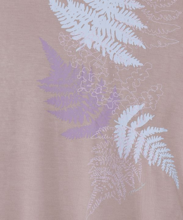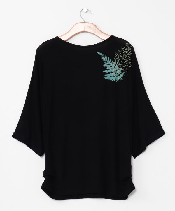 神聖なファーン柄を配したドルマンスリーブトップス。落ち感のあるレーヨン素材とゆったりとした袖が女性らしいシルエットを演出し、二の腕も自然にカバー。前後2way仕様で着こなしの幅も広がり、日常にもレッスンにもおすすめです。