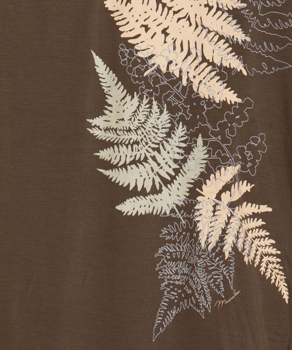 神聖なファーン柄を配したドルマンスリーブトップス。落ち感のあるレーヨン素材とゆったりとした袖が女性らしいシルエットを演出し、二の腕も自然にカバー。前後2way仕様で着こなしの幅も広がり、日常にもレッスンにもおすすめです。