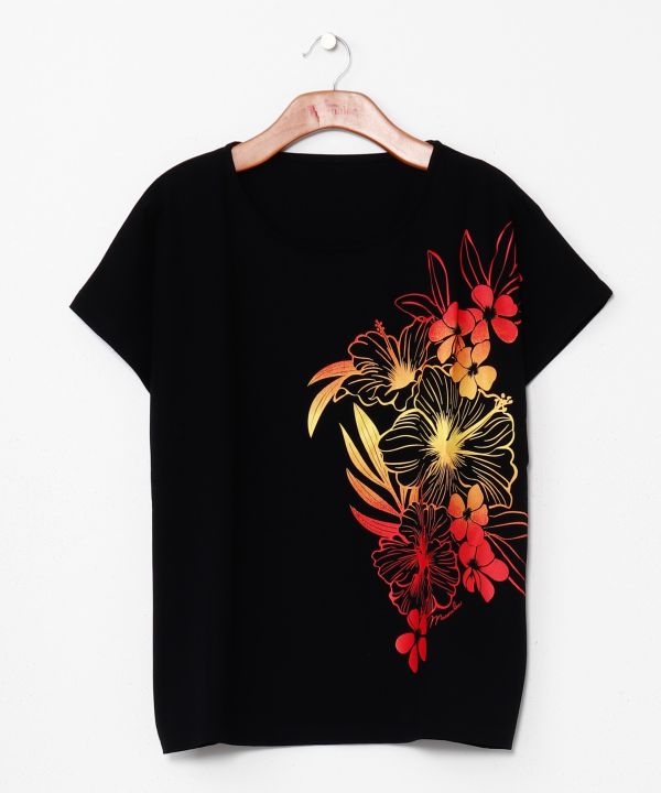 ハイビスカスとプルメリアのトロピカルアートをグラデーションで描いた華やかな一枚。ひんやりとした肌触りが心地よい接触冷感素材は、なめらかで快適な着心地。ゆったりとしたシルエットが体のラインを優しく包み、日常にもレッスンにもおすすめです。