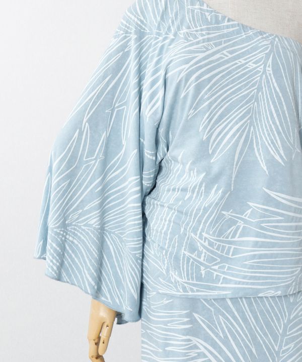 makani(風)を体現するしなやかなワンショルダードレス。美しいドレープが揺れるワンショルダートップとマーメイドスカートを組合せた汎用性の高いセットアップスタイル。アップテンポな曲からスローテンポの曲までこなせるデザインです。奥行きのあるムラ染め調のベースに軽やかな風にそよぐパームリーフをプリントしました。お手持ちのアイテムと組替えてアレンジコーデがお楽しみいただけます。