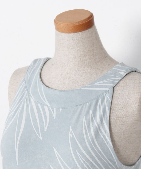 自由なスタイルでHulaを楽しむニュースタイルドレス。ミニマムタイトなシルエットのトップスと、贅沢なボリュームシルエットが美しいパンツを組合せた汎用性の高いセットアップスタイル。アップテンポな曲からスローテンポの曲までこなせるデザインです。奥行きのあるムラ染め調のベースに軽やかな風にそよぐパームリーフをプリントしました。お手持ちのアイテムと組替えてアレンジコーデがお楽しみいただけます。