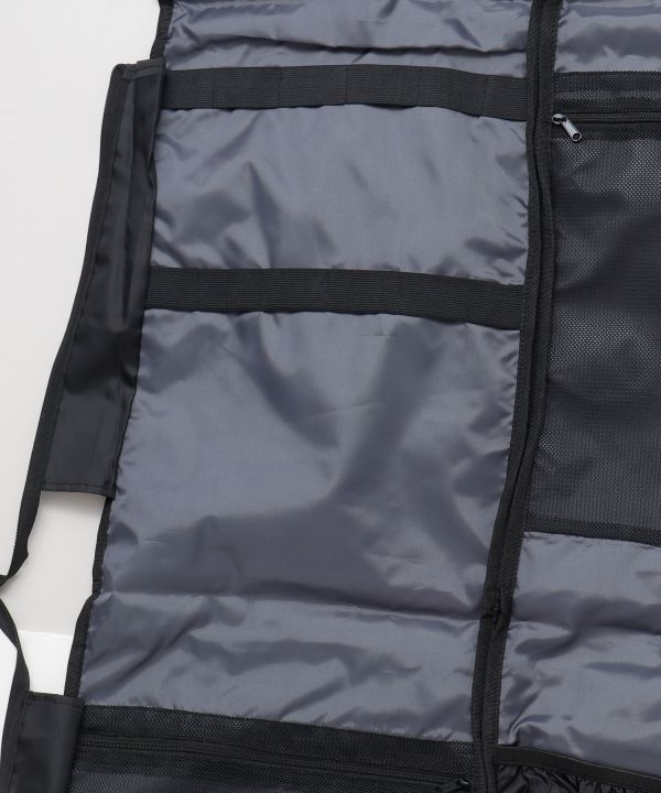 大胆なモンステラ柄とゴールドプリントが印象的なガーメントバッグ。ドレスを最大5着収納可能で、メッシュポケットやクリップ用バンド、ハンガー通し穴など機能も充実。スタイリッシュなデザインで、フラのステージやイベントに頼れる実用派アイテムです。