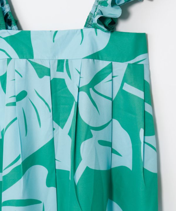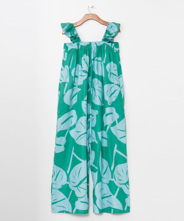 フリルショルダーが華やかなアクセントになったサロペットパンツ。大ぶりのアンスリウム柄が全体に映え、リゾート気分を高めてくれます。ワイドシルエットで体のラインを拾わず、リラックス感のある着心地が魅力。カットソーやシャツとのコーディネートで幅広く楽しめる一着です。