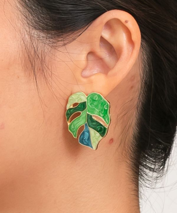 艶やかな光沢とカラフルな彩りが印象的なモンステラモチーフのアートピアス。立体感のあるデザインが耳元に存在感を与え、コーディネートにトロピカルなアクセントを添えます。デイリー使いやリゾートシーンにもおすすめです。