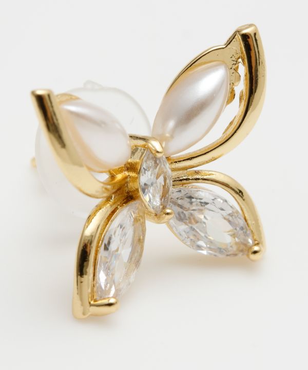 艶やかなメタルと透明感のあるストーンが調和したピアス。プルメリアや花モチーフが優美に輝き、耳元に上品な華やぎをプラスします。軽やかな着け心地でデイリーにも取り入れやすく、ドレススタイルのアクセントにもおすすめです。