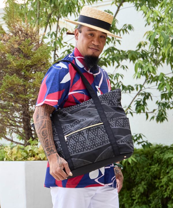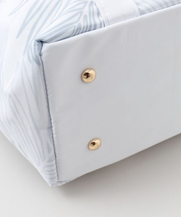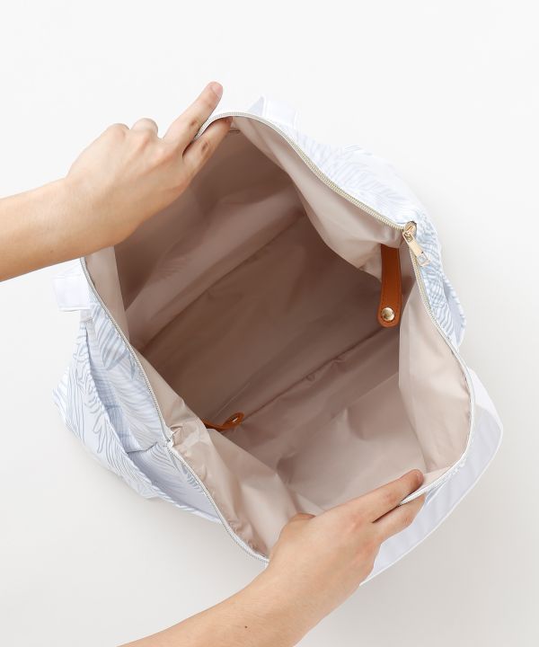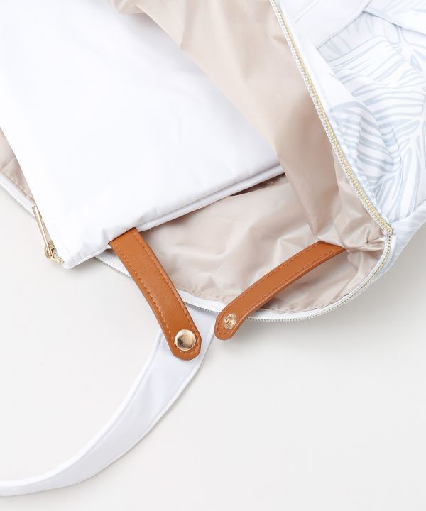 レッスンや遠征に活躍する大容量トートバッグ。トロピカルな柄と落ち着いた配色が魅力で、スーツケースにも取り付けできる仕様がうれしいポイント。外側にはポケットが沢山あり仕分けに便利で、内側には取り外し可能な防水ポーチ付き。機能性もデザイン性も備えた実用派バッグです。