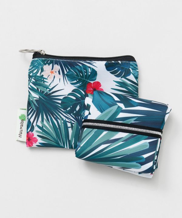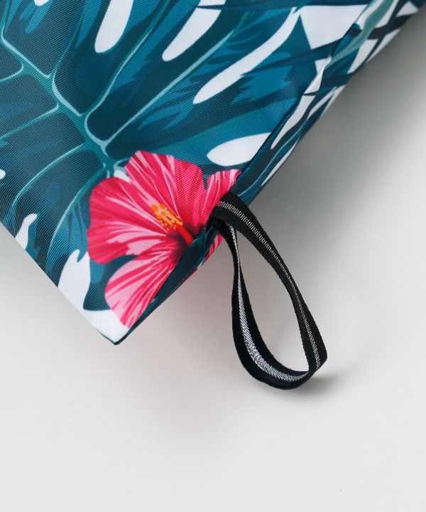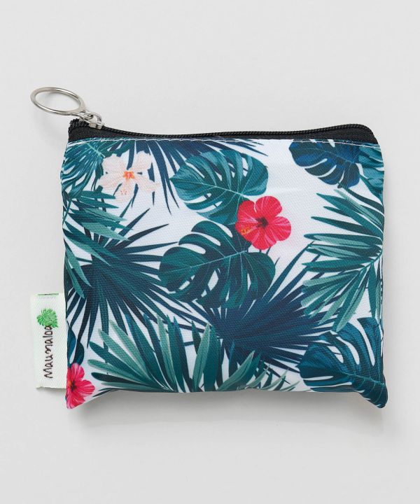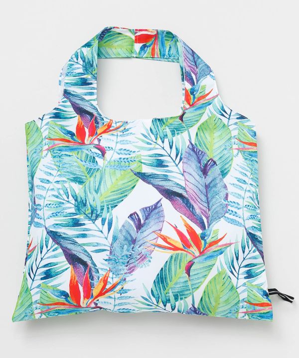 トロピカルなリーフ柄が目を惹くエコトートバッグ。軽量でたっぷり入る大容量サイズで嬉しいポーチ付き。フラのレッスン用や旅行、ショッピングなど幅広いシーンにおすすめです。