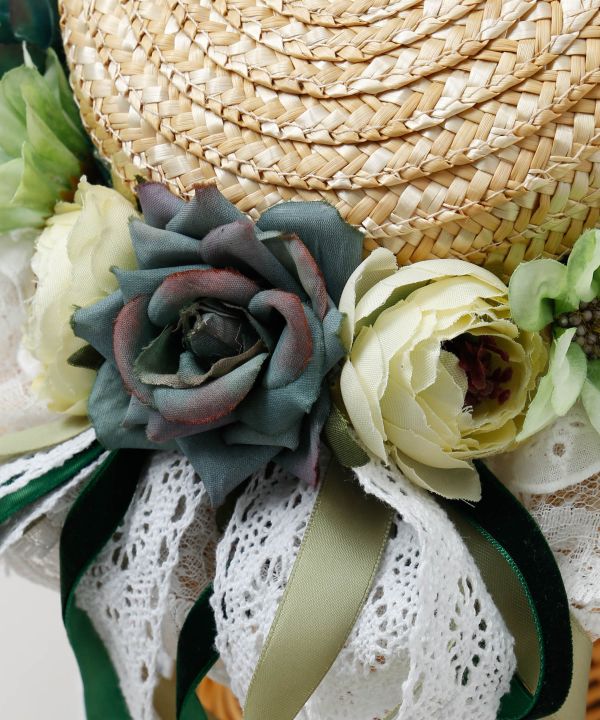 華やかなローズと繊細なレースで装飾されたクラシカルなハット。クリップ付きで着脱も簡単、しっかり固定できるのも嬉しいポイント。麦わら素材のナチュラル感とリボンのアクセントが、フラやイベント衣装に上品な可憐さを添えます。